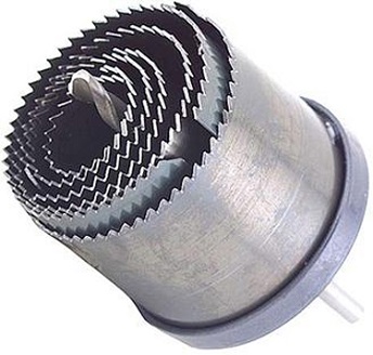Includes 7 hole saws. Cuts 1", 1-1/4", 1-1/2", 1-3/4", 2", 2-1/2", and 2-1/2" through wood, pressed wood, or plastic. Slug-ejector prevents clogging. Built-in blade selector on housing. 1/4" shank. Carded.